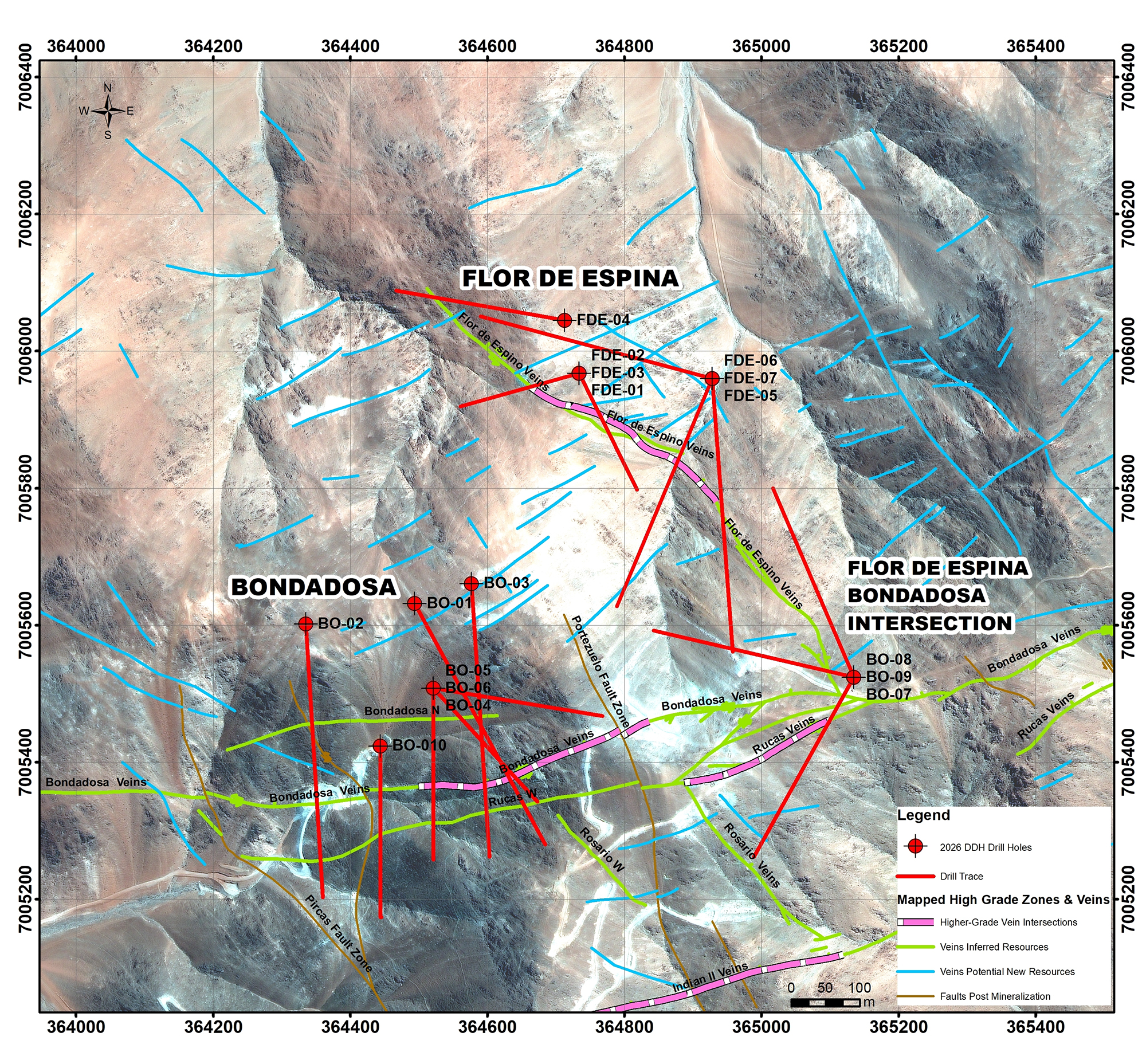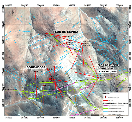 - Test down-dip extensions of the Bondadosa and Flor de Espino gold veins and the potential for higher grade and wider zones of mineralization at the intersection of the two veins.