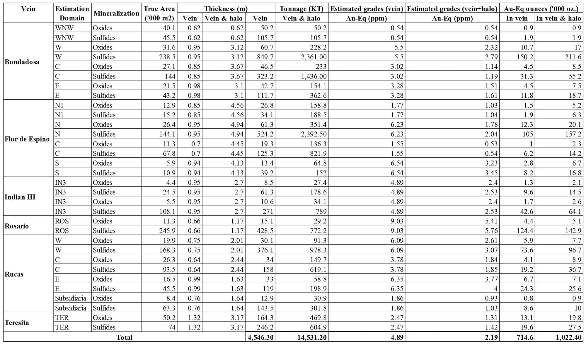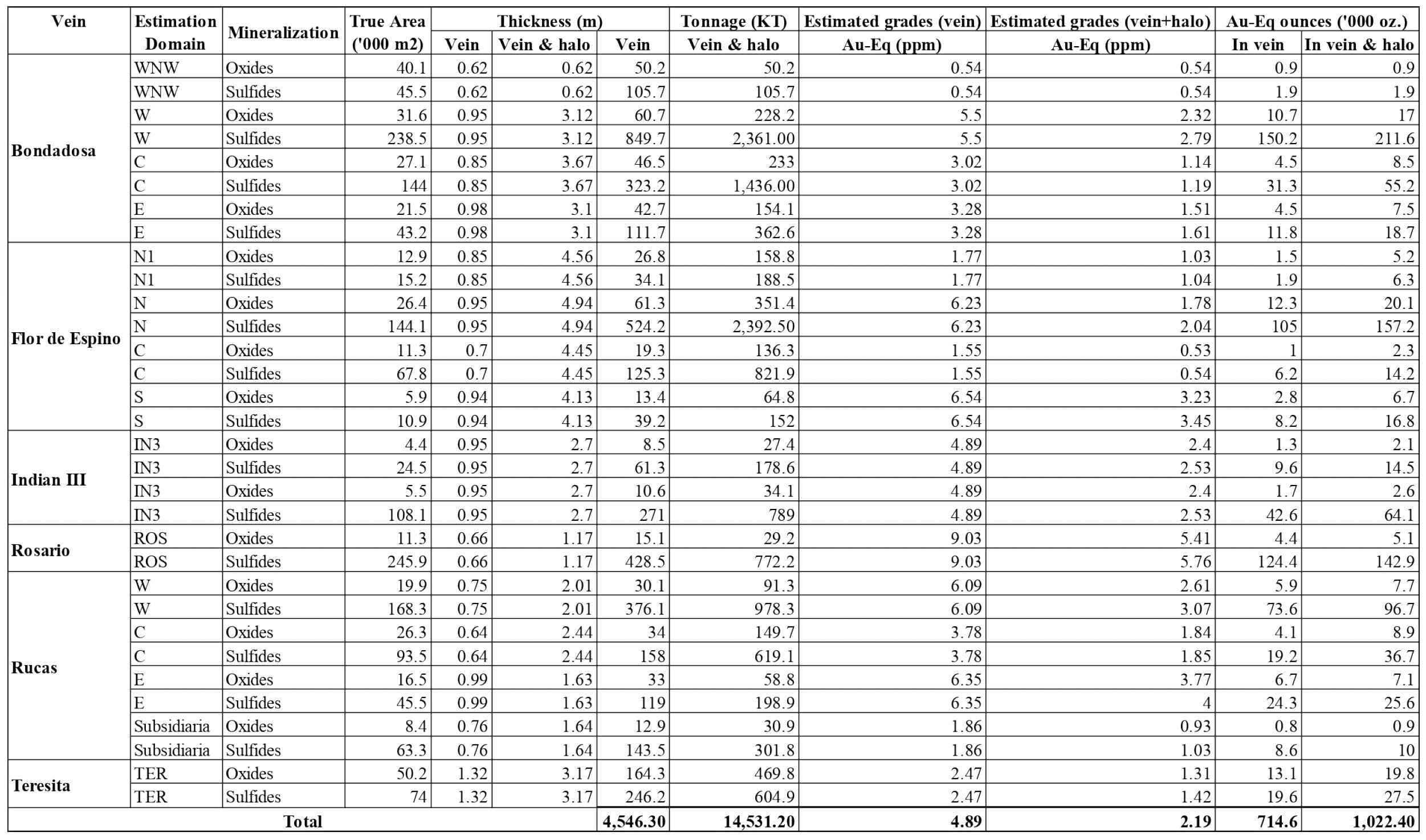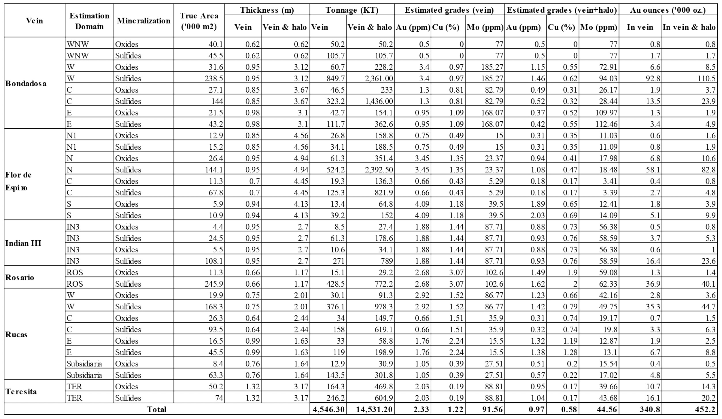 2 Gold equivalency based on the following prices: gold US$1,100/oz, copper US$2.80/lb, molybdenum US$12/lb, and adjusted for the following recovery rates: gold 75%, copper 88%, molybdenum 60% (e.g., 1 pound copper = (1 x $2.80) / $1,100 x (88% / 75%) AuEq). Areas, tonnages and metal content are rounded to the nearest hundred square metres, tonnes and ounces, respectively; vein thickness is rounded to the nearest centimetre, grades are rounded to two decimal places. Rounding may result in apparent differences between tonnes, grade and metal content. Inferred mineral resources were estimated as a global inferred geological resource using a vein accumulation methodology base on true widths, with grades estimated using Sichel’t estimation due to limited data density. No cut-off grade was applied to the inferred mineral resource estimate.